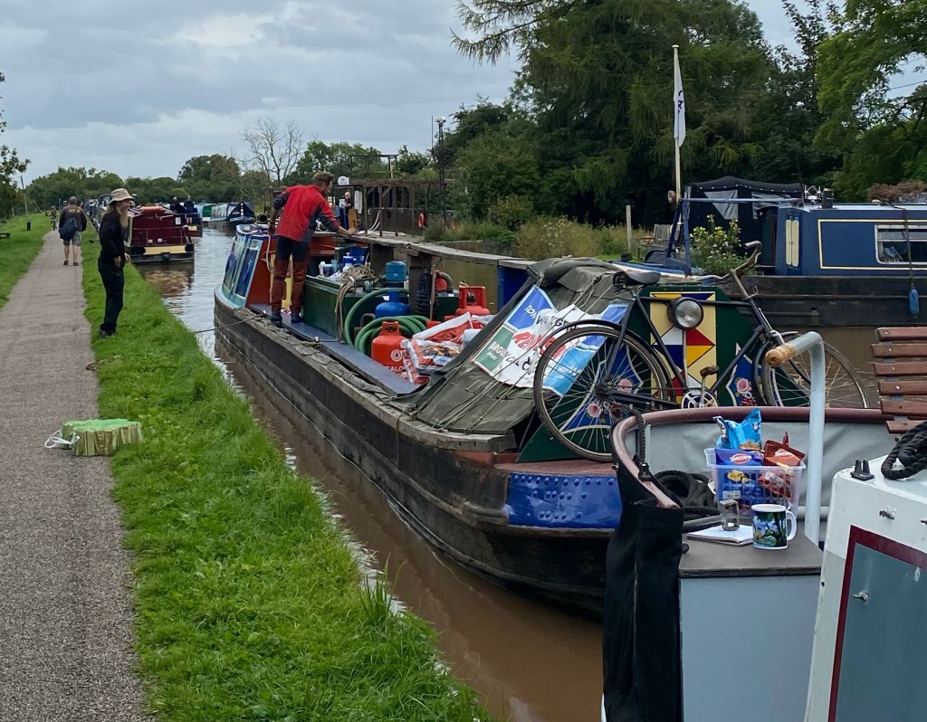 You always know when you’re approaching a town as the moorings get denser and Nantwich was possibly the most dense i’ve experienced yet. Boats moored either side leaving just enough space for 2 boats to pass. We were behind the fuel boat and watched as they speedily pulled over to sell their wares to a customer. I had to slow right down as someone was coming through the tiny bridge hole but with no space to really play with for all the moored boats, I struggled to bring her in nice to be able to leave a gap for them to pass. We got there in the end and we got over to the towpath and took a line ashore to wait for them to come past. The fuel boat was quickly on us again but I decided to seize the opportunity, seeing as the seasons are changing, to grab some coal and kindling. Plus i’m a little nervous about our draught (depth) on the Llangollen as we’re right on the borderline of being too deep so some coal on the front end will help bring her bum up a little.