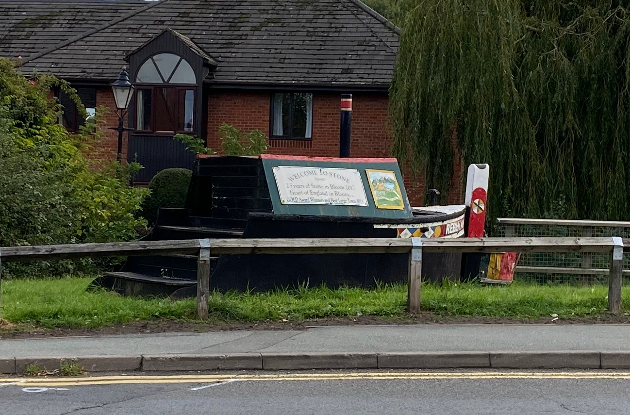 Above, a couple of lock pictures, a submerged motorbike, passing Stone Brewery, some impromptu wooden lady sculpture and a mini narrowboat on the road next to a lock announcing the entrance to Stone.