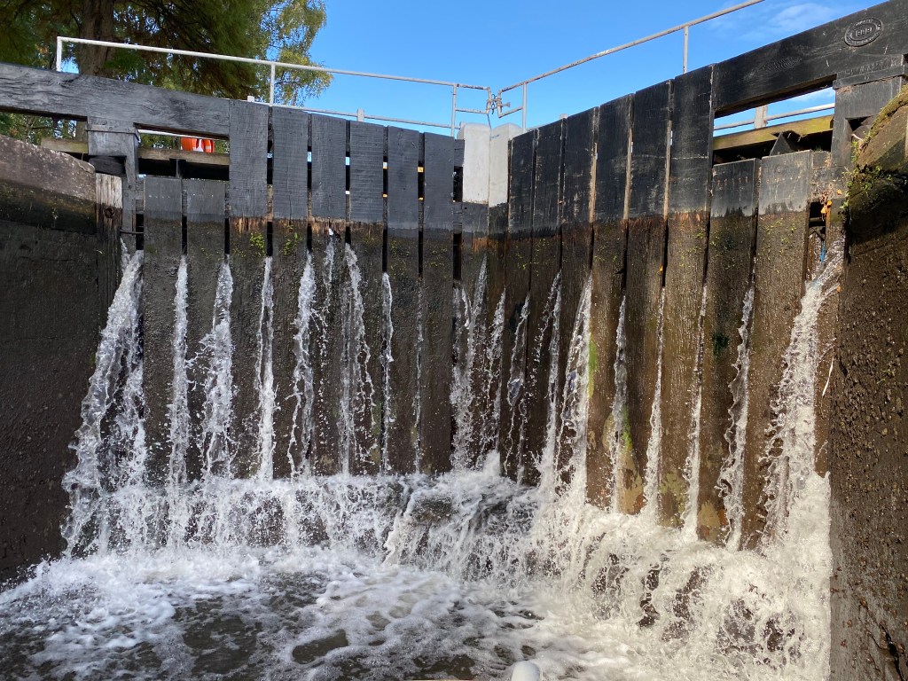 The open gate showed the rivers flow for the first time and she was definitely going. I went for power and hooned it out of the gates to join the wash of the river coming at us from the right. There was a definite moment of the boat going sideways, being pushed by the current before I could turn her enough to be pointing in the right direction.