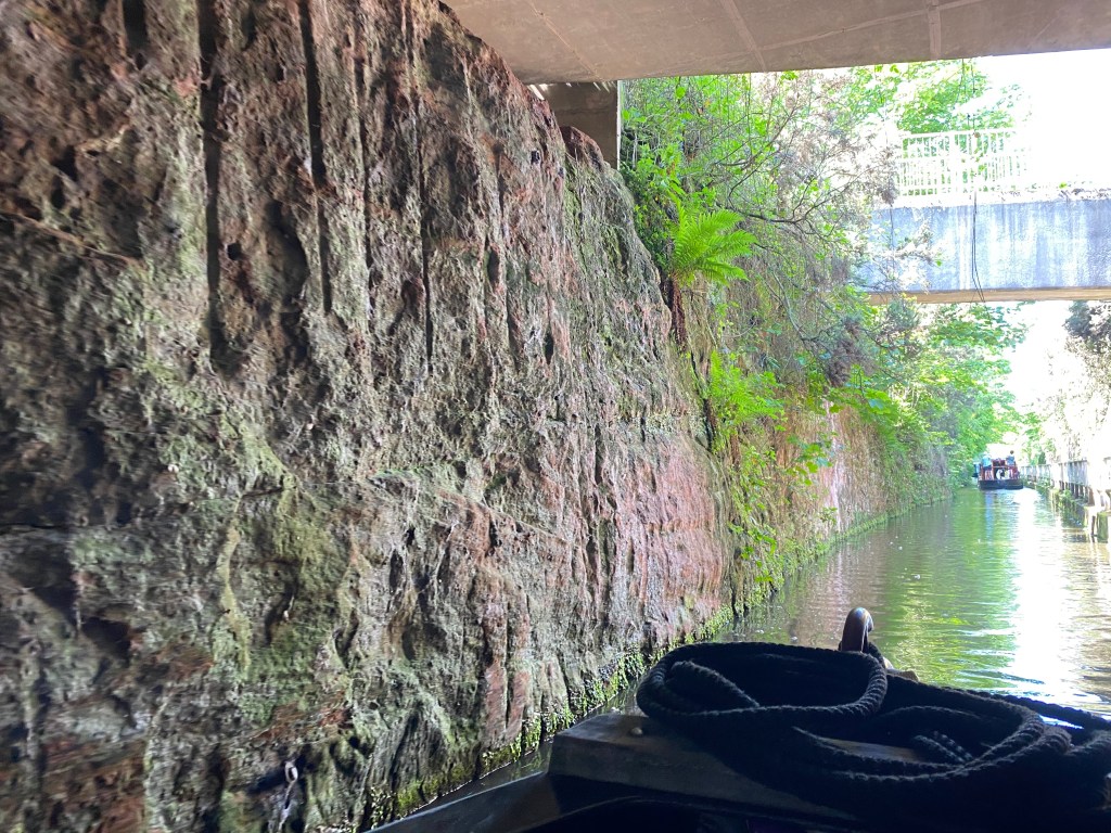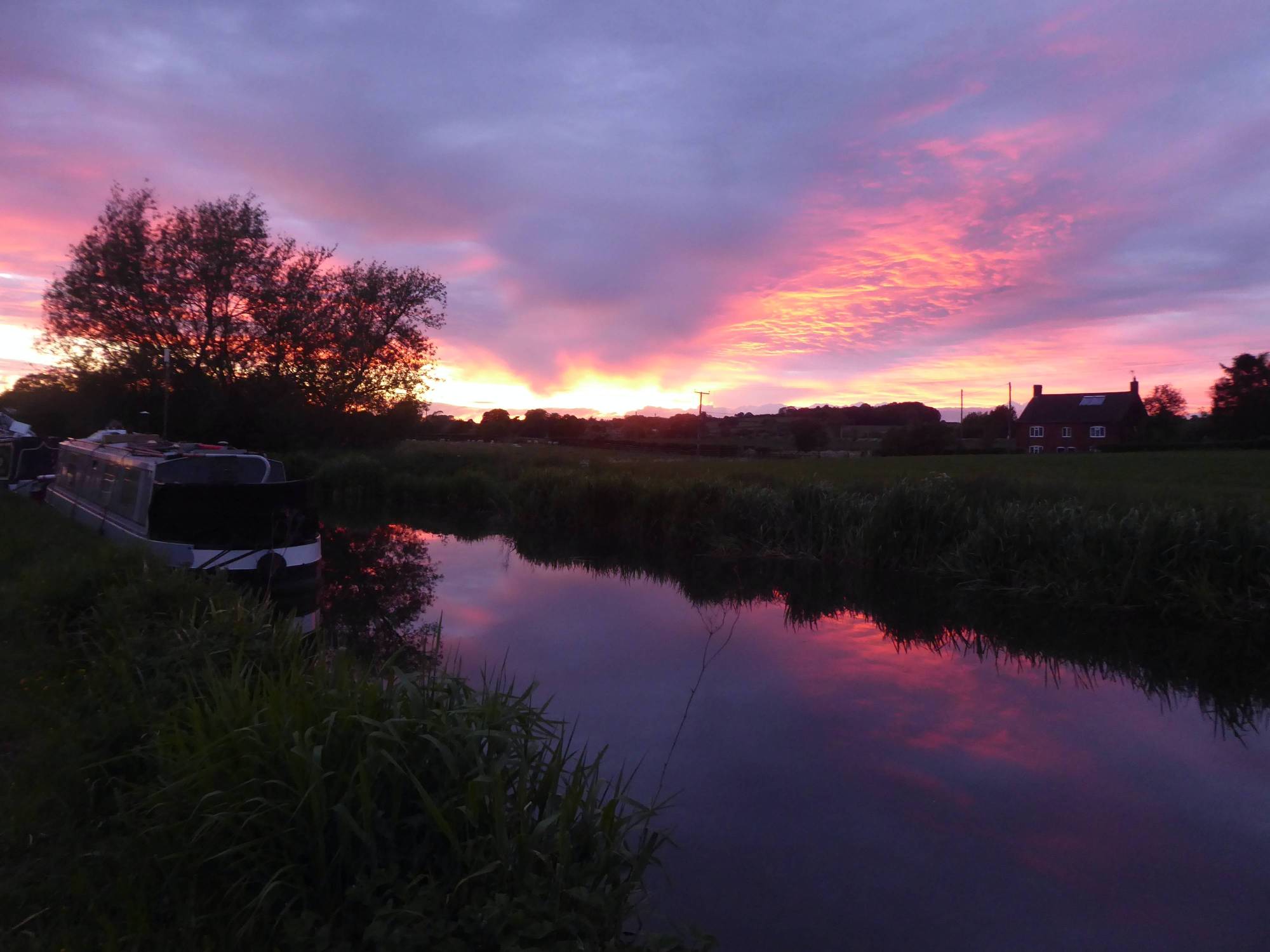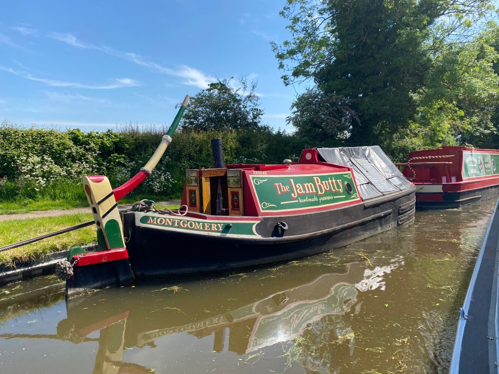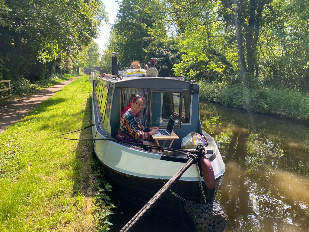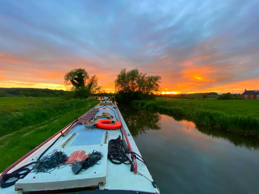 Had a couple of slow boaters ahead that thankfully stopped for lunch which gave us a window to overtake. It’s not like we’re going fast (hardly at 3mph) but Māhina has a big engine and a big prop so often the tickover speed is faster than others and there’s only a certain amount of distance we can go dropping from in gear to coasting that I can deal with. It was a beautiful day weather-wise and the cabin provided some lovely shade for the working desk but it wasn’t long before we saw an ideal mooring to stop for the night……in the middle of random fields, lovely.